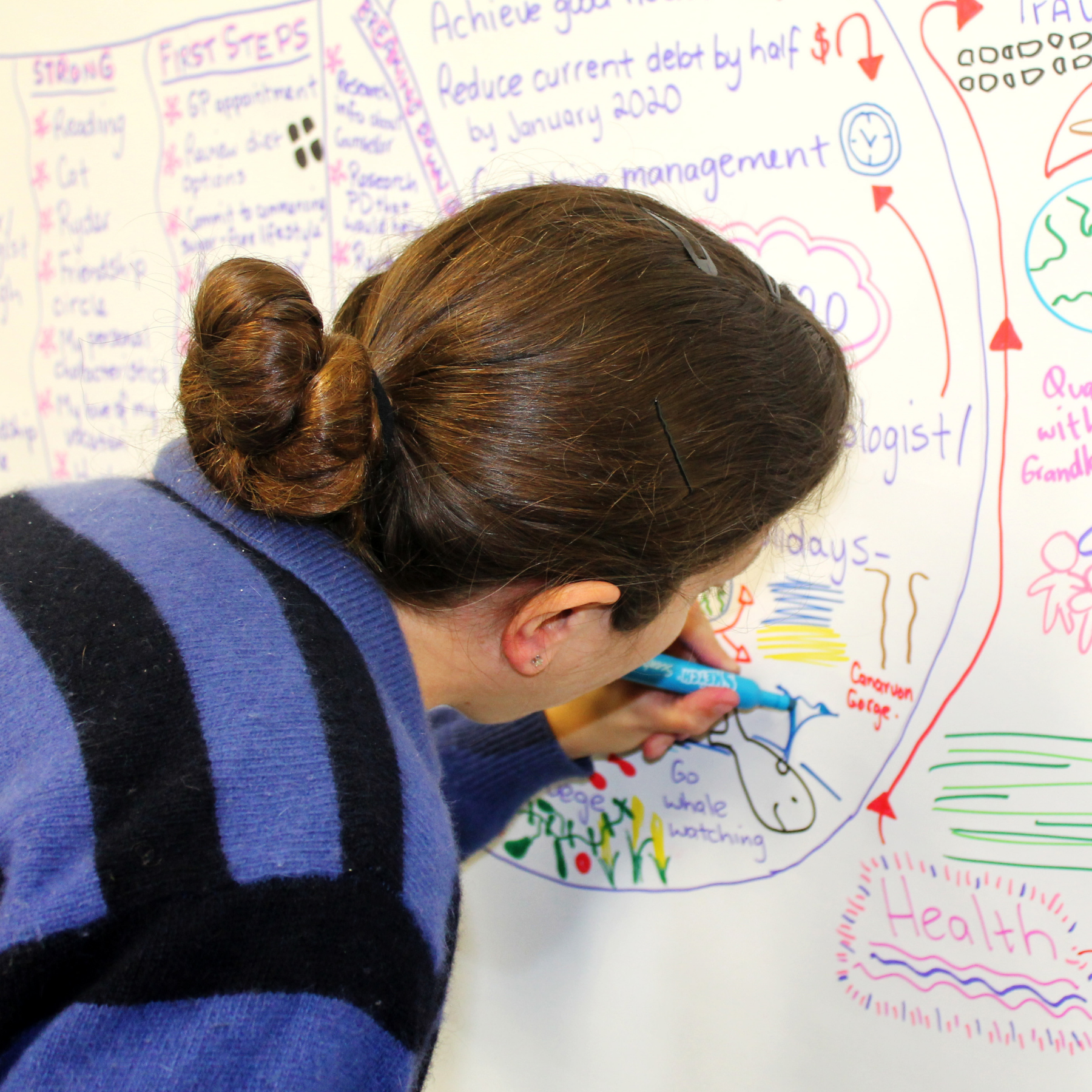 Our team of two will listen intently to your goals while visually mapping your plan using your preferred colors. This technique provides a comprehensive plan that can be utilised throughout the year and beyond, giving you the confidence to continue ahead on your path.
